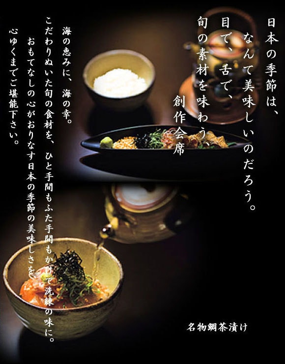 穏やかな内海で育った豊富な海の幸と山の幸。四季それぞれの旬の味を演出する。創作料理をご堪能下さい。