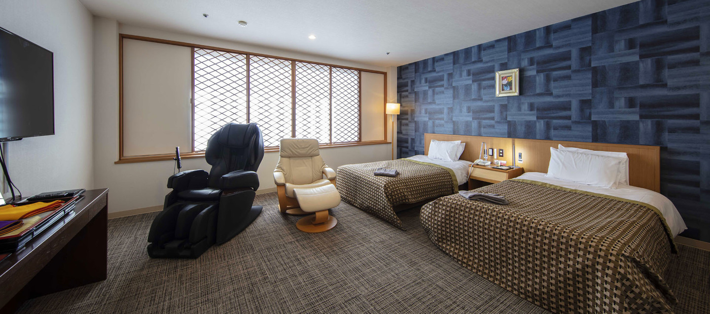 客室設備 | セミダブルサイズツインベットルーム、52インチフルハイビジョンモニター、マッサージチェアー、リクライニングチェアー、DVDデッキ(DVDソフトの貸し出しもございます)バス・トイレ付きです。 |